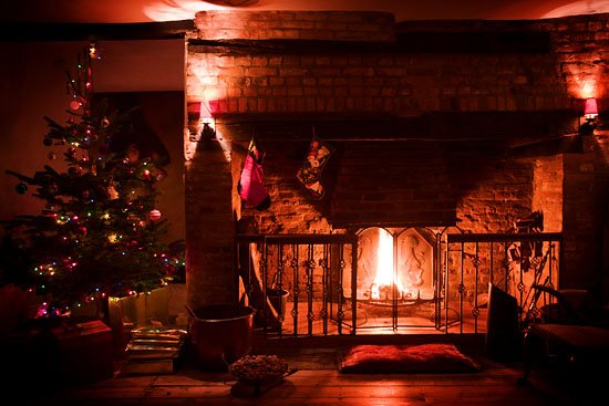 two empty stockings hanging in front of the fire.