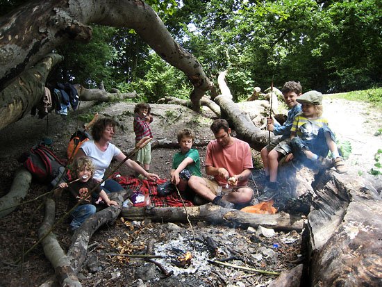 enjoying a sausage sizzle followed by toasted marshmallows.