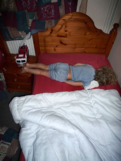 no duvet, no pillow, face down and feet on a bedside table.