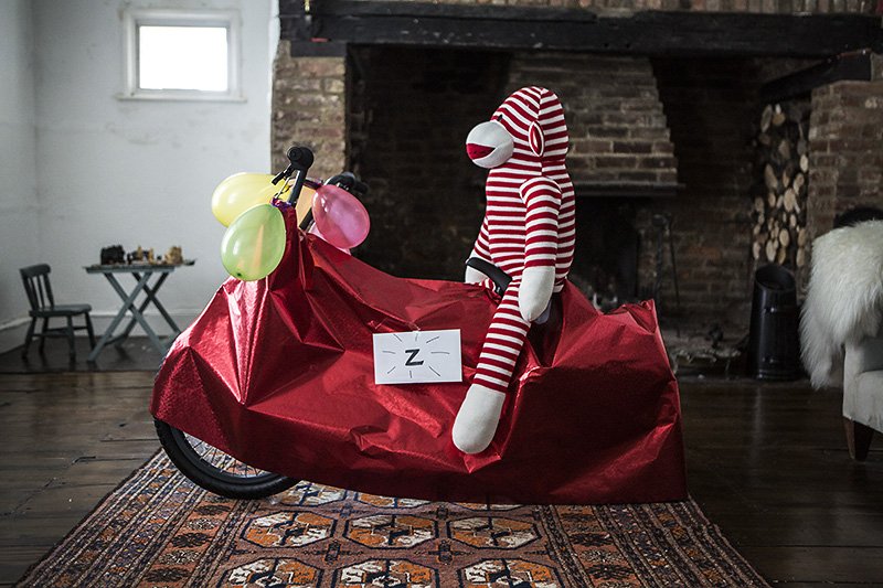 z's birthday present (a ride on lawnmower, a mobility scooter, a bmx) was waiting to be discovered.