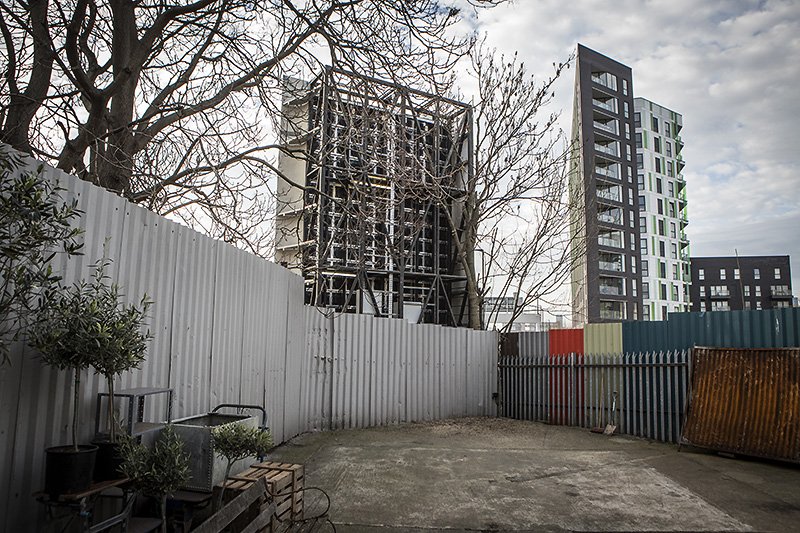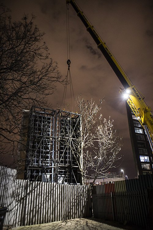 returned to a 100ft crane lifting in a HUGE digital billboard into place the street side of the bunker yard.